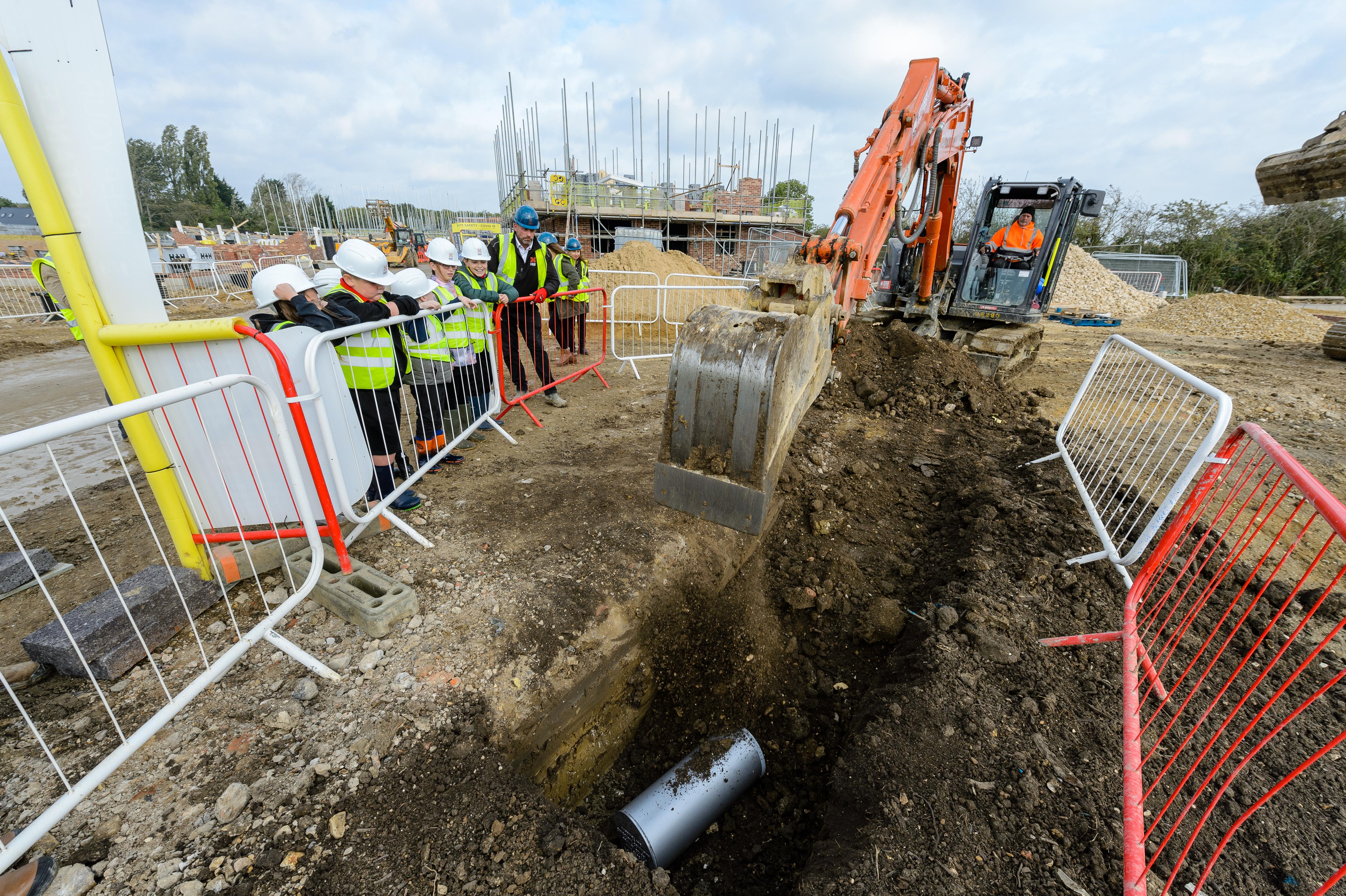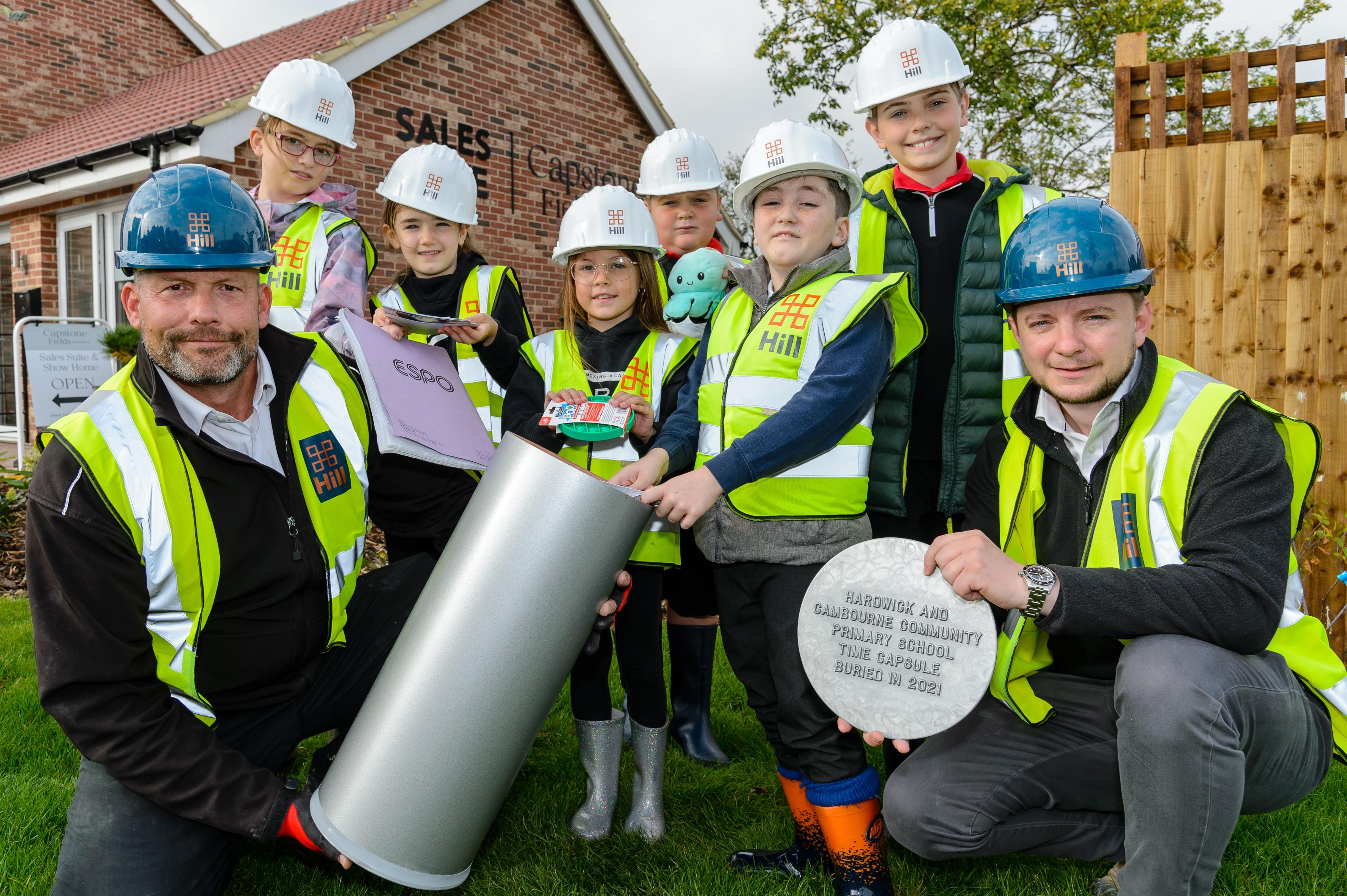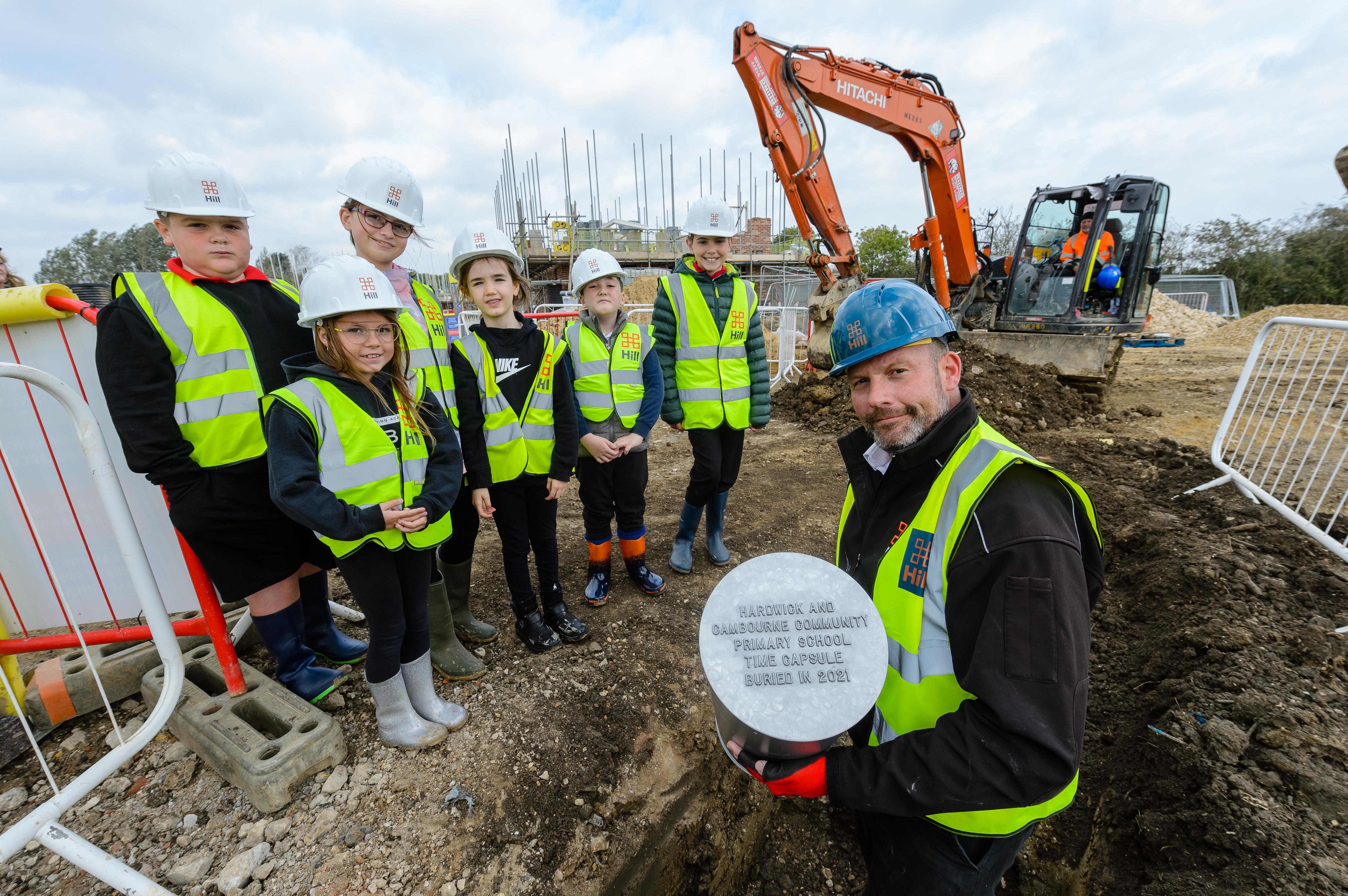Hardwick school council, our pupil governor and deputy pupil governor took a trip down to the new Hill housing development on St Neots road. Once equipped with PPE, the children had a tour of the site, had a demonstration of the forklift and excavator and then added some items to the time capsule (school work, guides to the school, a face mask, hand sanitiser, toys , photos and a book bag) and watched it be sealed and buried.