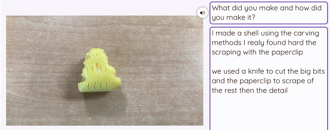 In Sculpture, Year 3 and 4 have been developing their understanding of form and detail through soap carving. Pupils began by creating observational sketches of seashells and sea creatures, concentrating on contour lines, fine textures, and subtle markings to help them notice intricate features. Using these studies as reference, they practised controlled carving techniques, such as scoring, shaving, and refining edges, to gradually remove material and shape their designs. Children experimented with different carving tools to create smooth surfaces, sharp ridges, and precise incisions, learning how to handle the soap safely and accurately. This activity helped them build confidence in manipulating materials, improving their dexterity, and translating detailed drawings into three-dimensional sculpture.